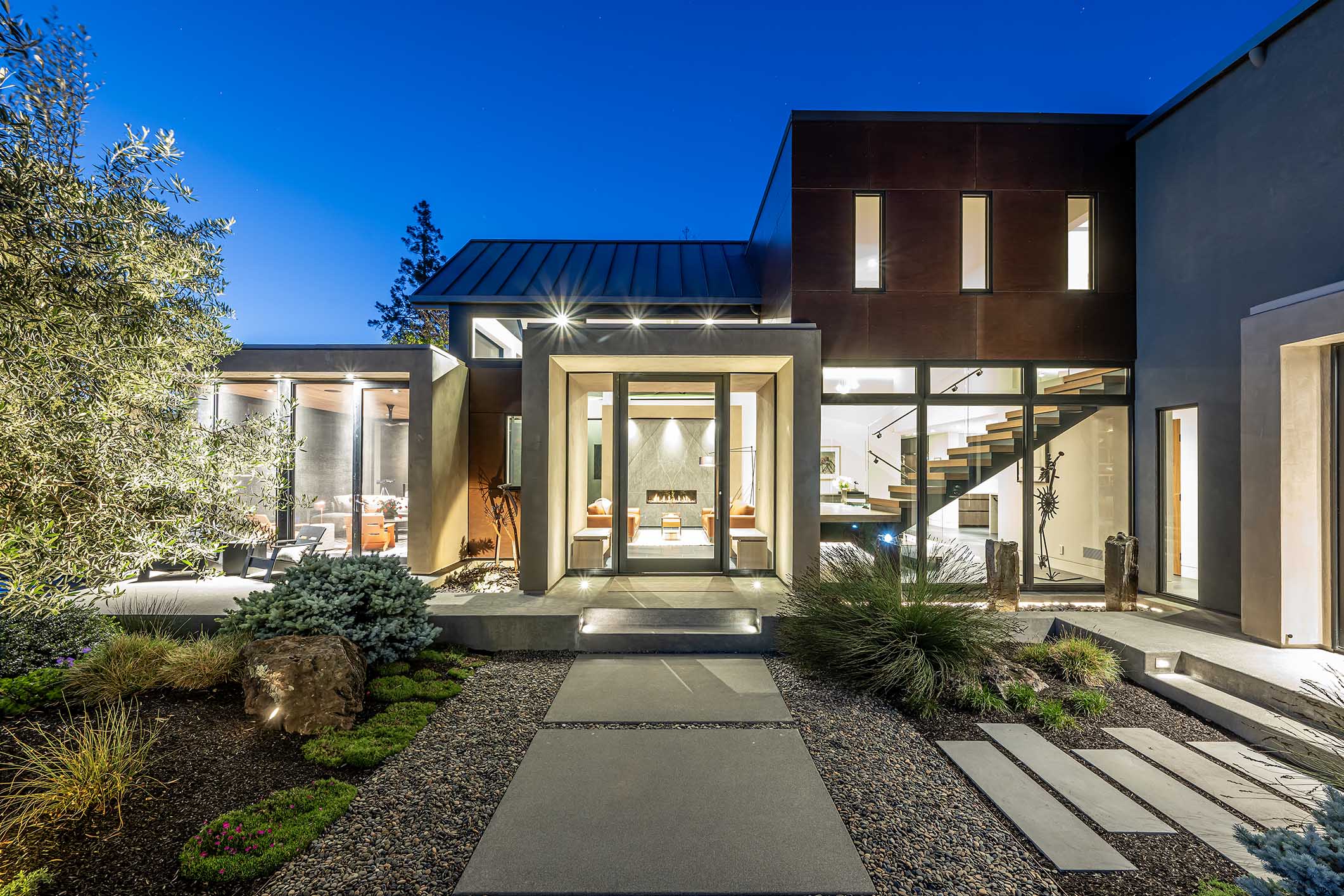 This striking contemporary residence perfectly articulates the art of arrival, by intentionally merging the best of bold design, warm modern materials, and refined indoor-outdoor living. A sculptural, tiered approach to the main residence creates a dramatic sense of reveal to this exquisite estate framed by sculptural landscaping and soft, integrated lighting. The smooth earthen-hued stucco façade blends with natural wood cladding, expansive windows, and glass walls; creating an interplay of geometry, scale and luminosity that is inviting and timeless.