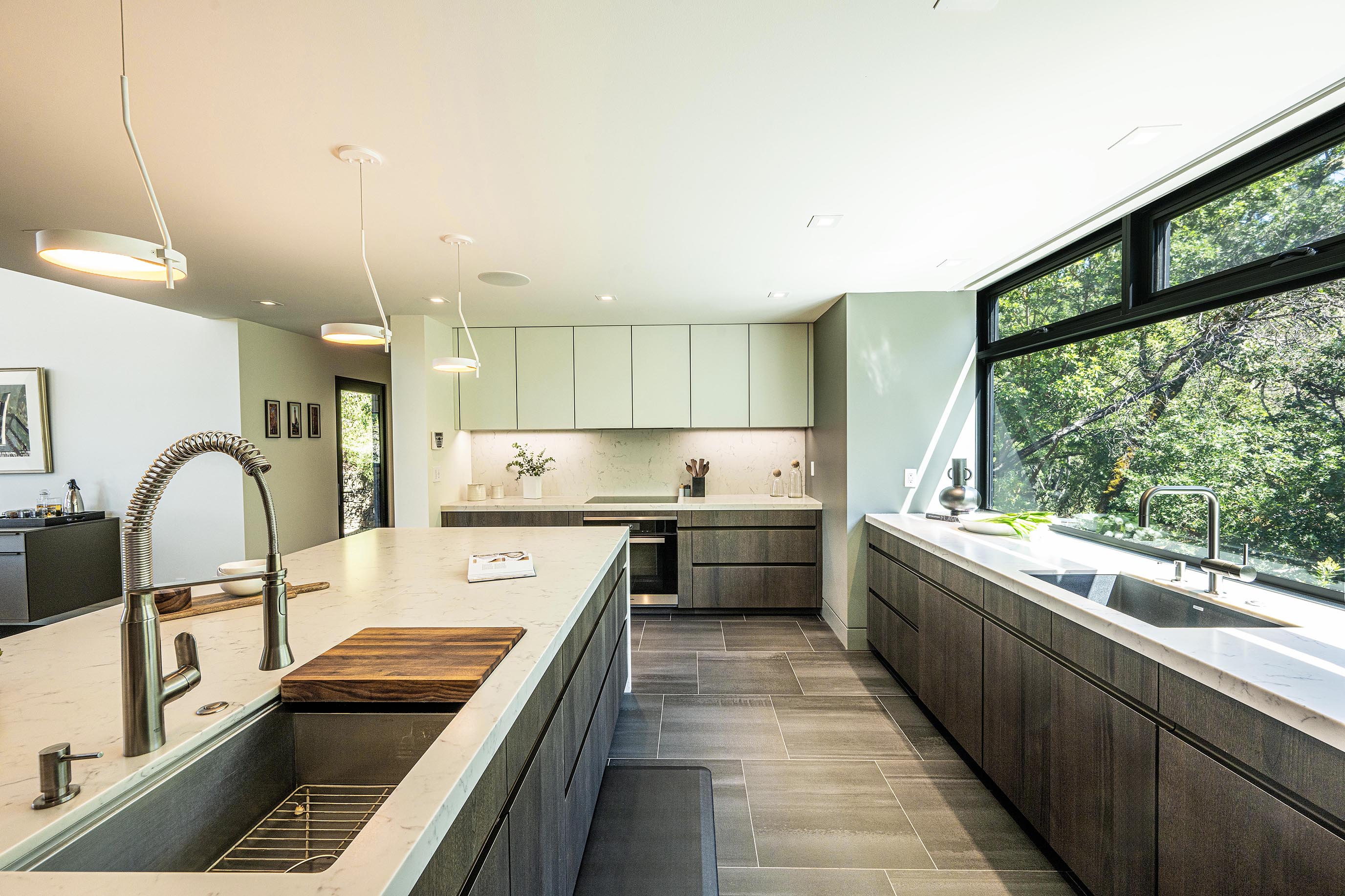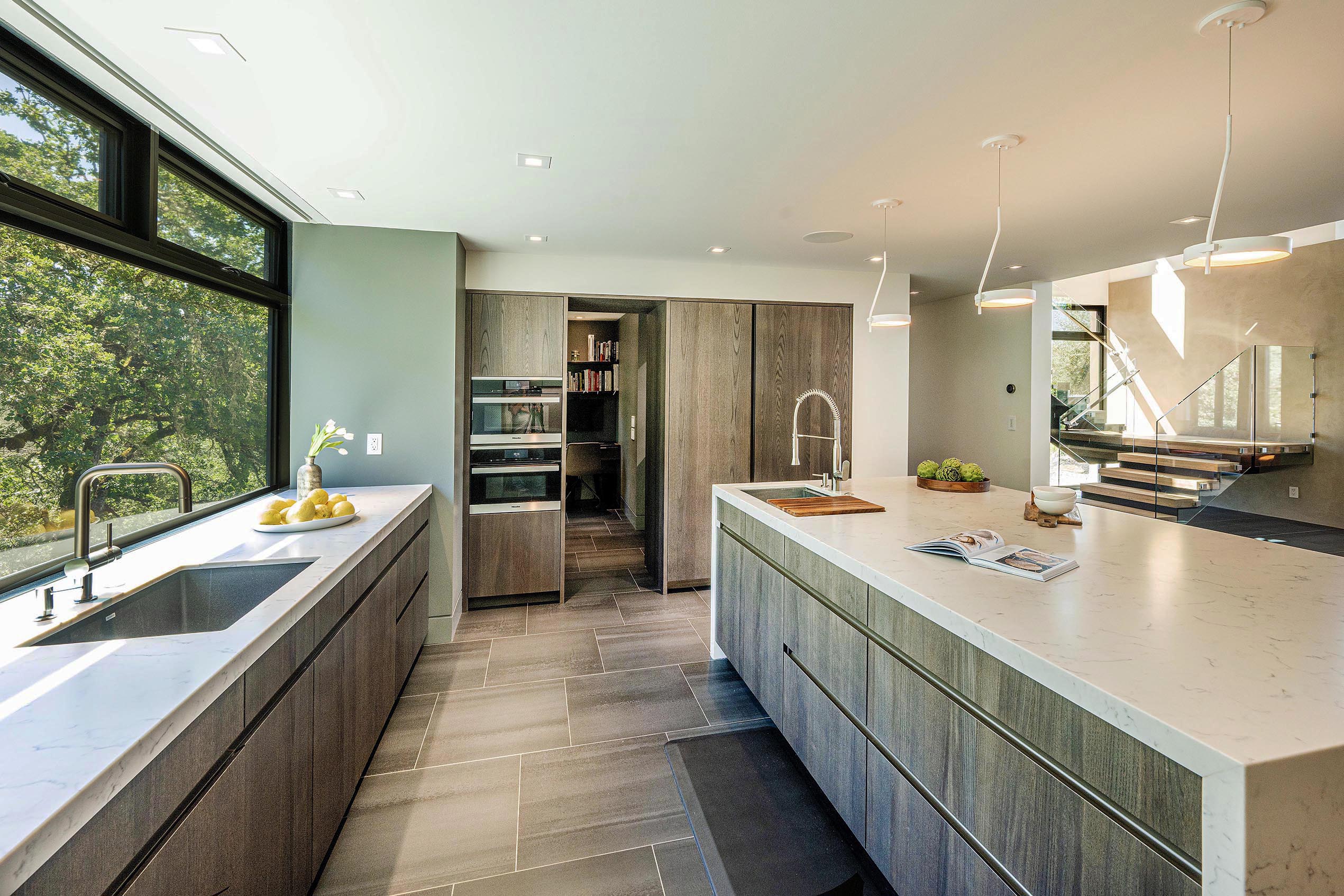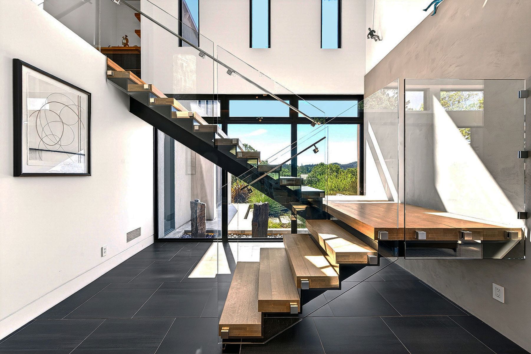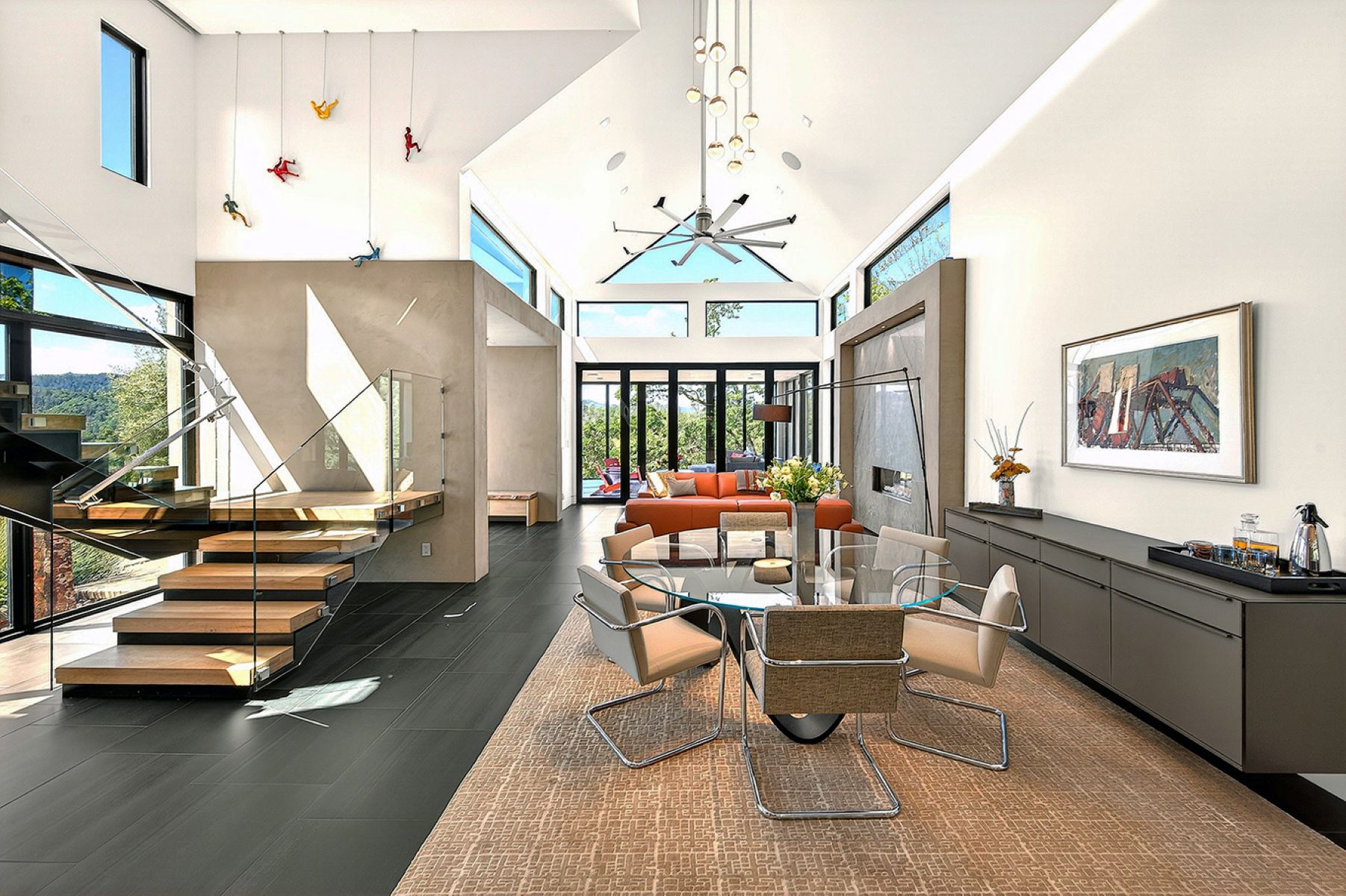 A dramatic great room anchors the open-concept layout that flows effortlessly between the living and dining space, where stunning lighting and minimalist detailing reinforce the sophisticated, uncluttered feel that is deeply connected to its natural surroundings. A wall of glass open to a heated screened porch; and an impressive monolithic fireplace offers a see-through connection to the exterior dining pavilion. A sculptural floating staircase blends engineering precision with artful expression, and the minimalist, yet highly functional, kitchen enhances livability and effortless entertaining.