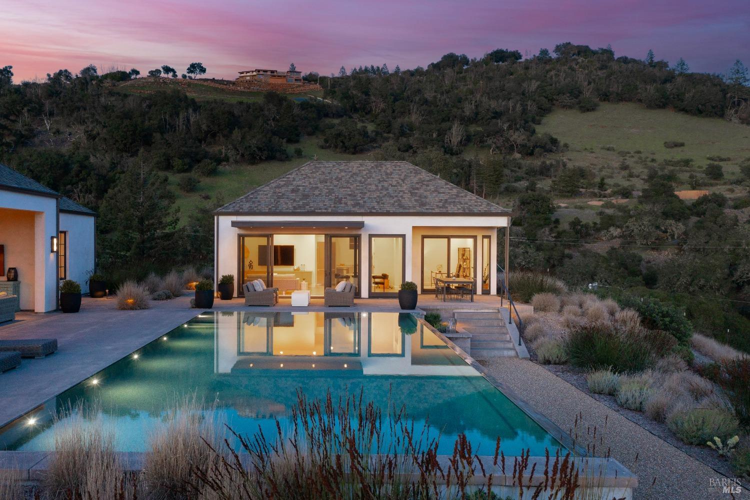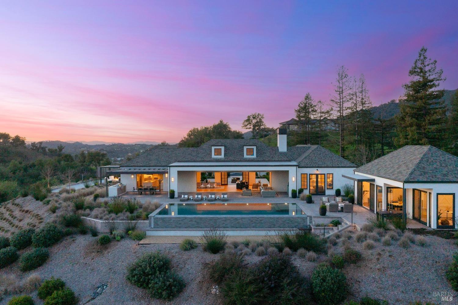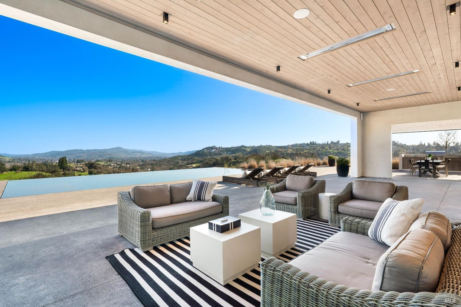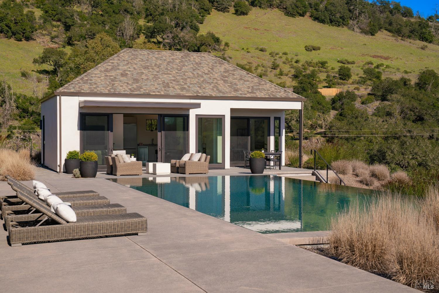 Stunning contemporary home set in the lower hills of Foothill Ranch features breathtaking views. Luxury & superb design combine with exceptional value for the discerning buyer looking for a new home. The 5,600+/- sf gated estate features 4 ensuite bedrooms & media room in the main residence, plus a detached pool house w/bath, kitchenette, and flexible space for an office or gym. A private entry courtyard with a vanishing edge fountain welcomes guests. The open, single-level floor plan boasts lofty ceilings and broad hallways, centered around an impressive Great Room separating public and private spaces. Chef-inspired kitchen, designed for culinary enthusiasts, blends performance with elegant design; Thermador appliances, dual-column wine refrigerator, 6-burner gas range, two islands with a prep sink and bar seating. Glass pocket doors open to expansive outdoor living spaces, perfect for entertaining. Amenities include 20' x 40' infinity-edge pool, smart home technology, integrated speakers, covered & heated TV lounge, built-in BBQ, bocce ball court, and firepit. The 5BR septic allows for an ADU. Located minutes from shopping, transportation and wineries, the home offers access to hiking trails, private lake, and a strong sense of community. A "Best in Class" opportunity.