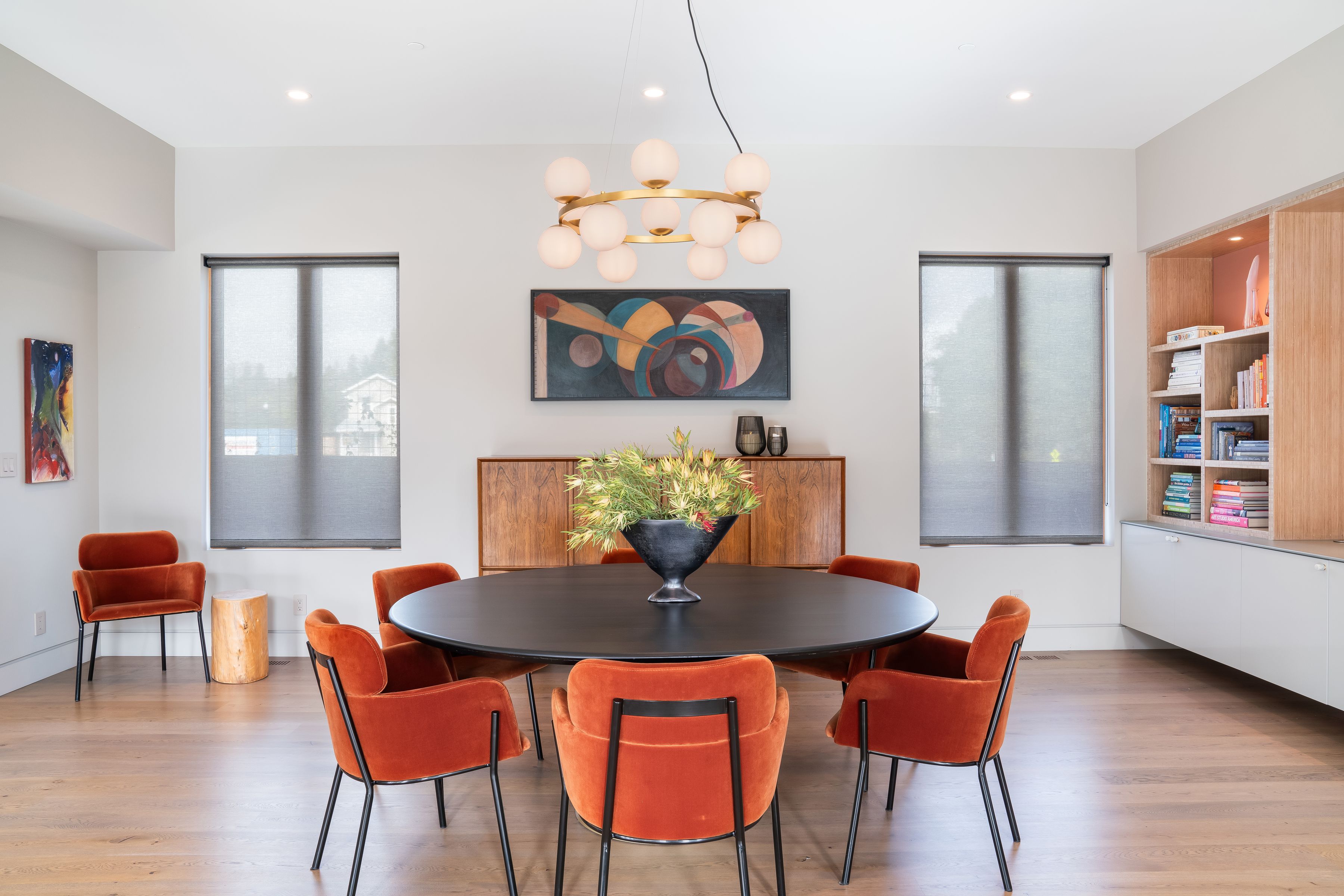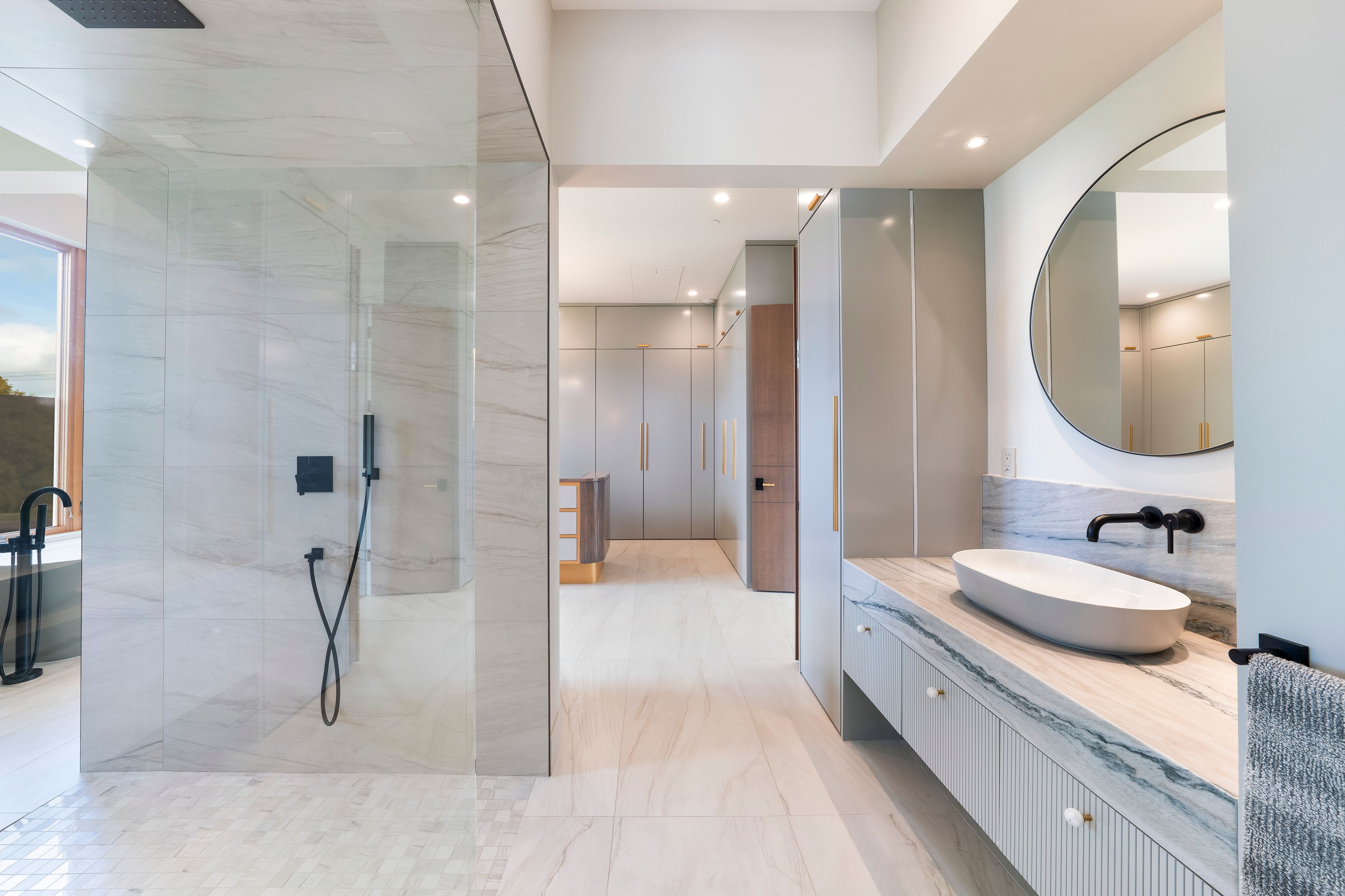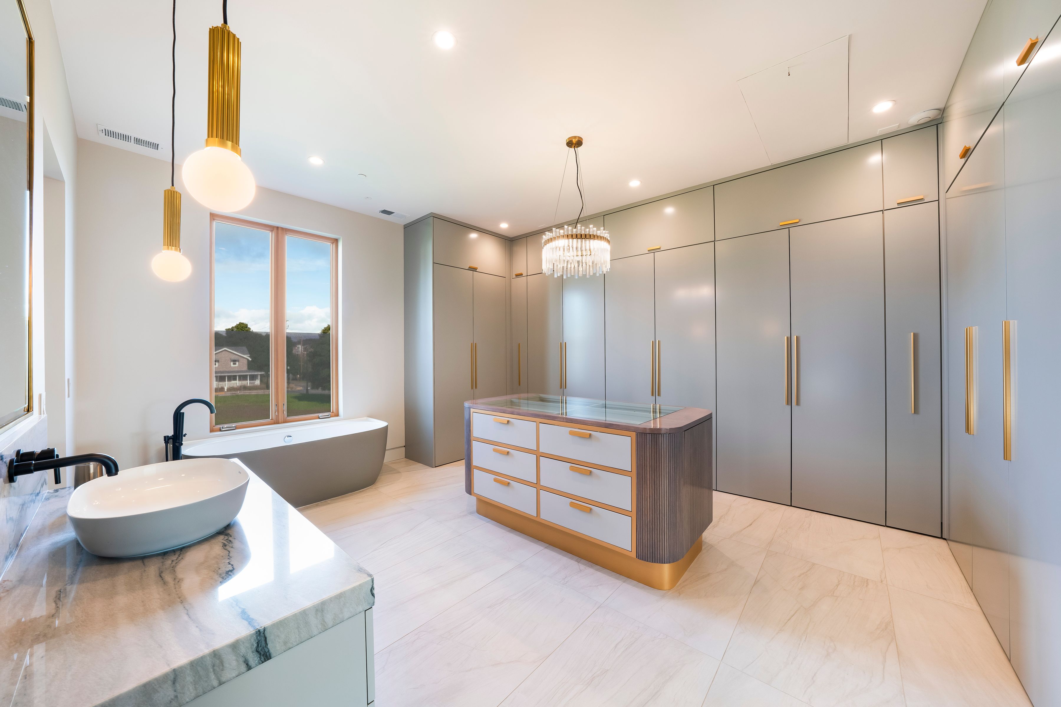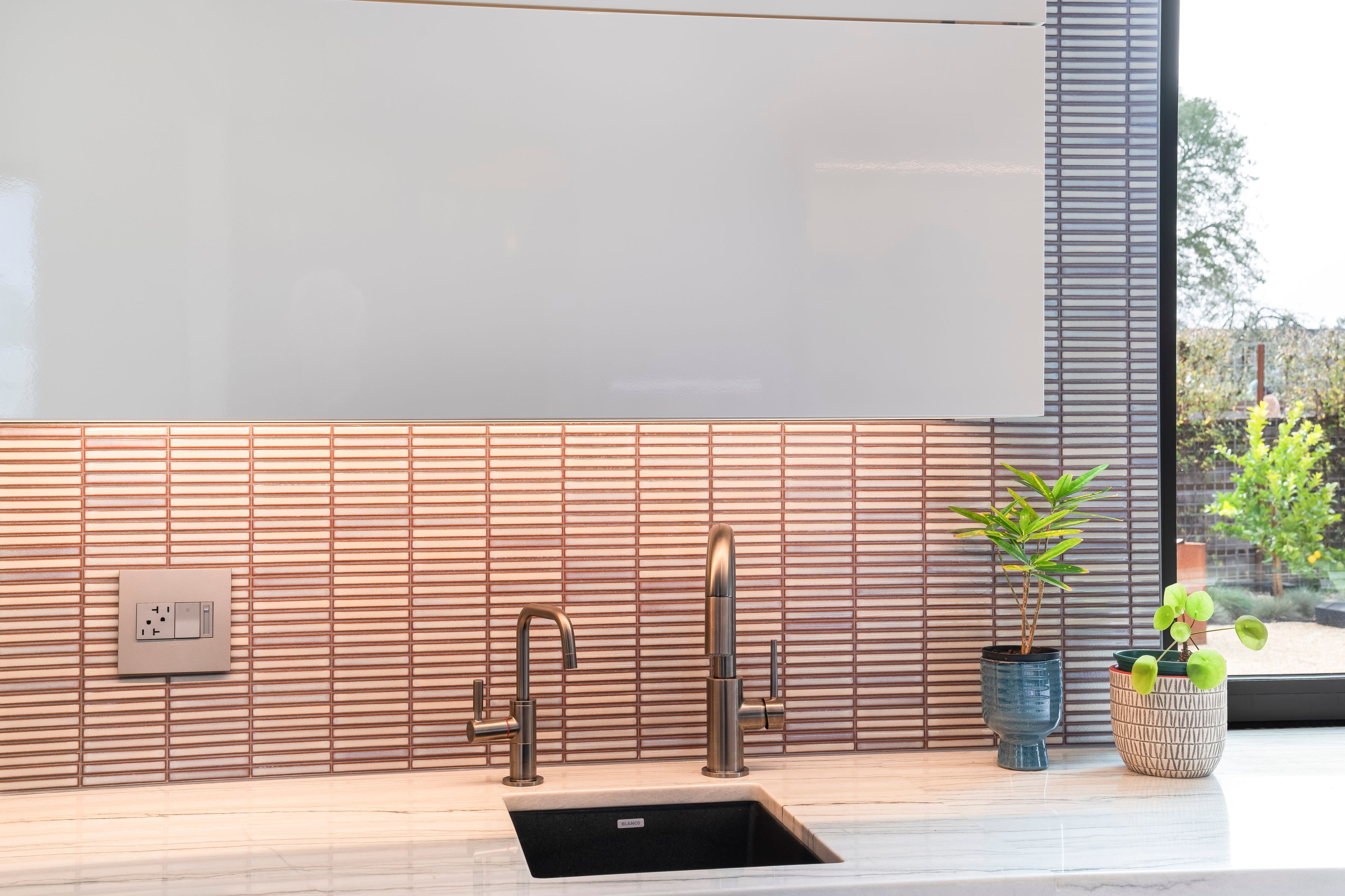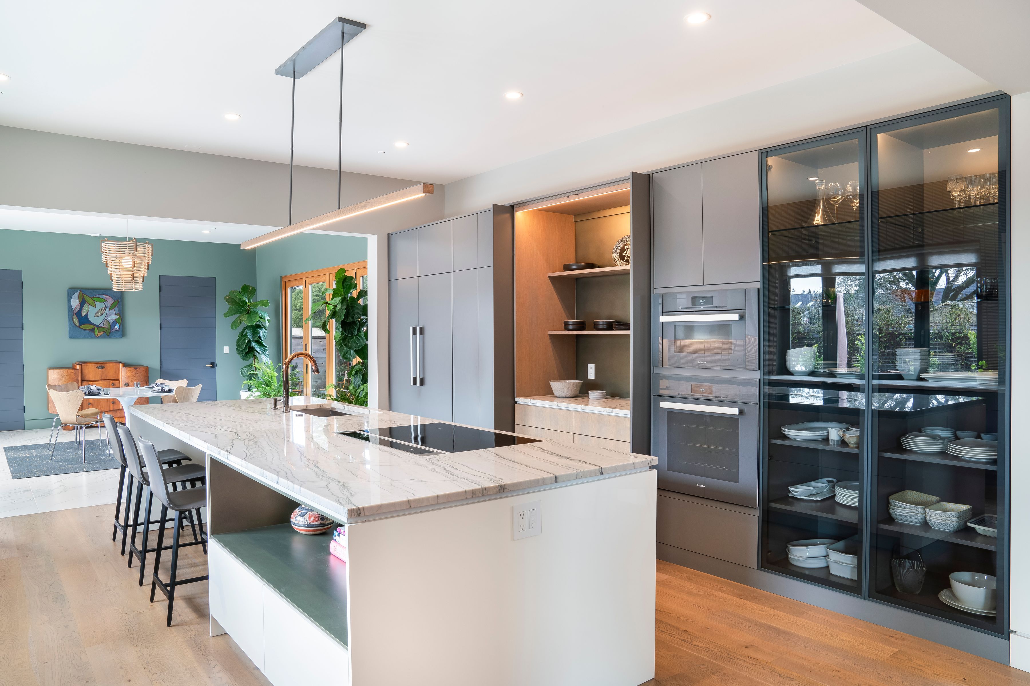 The interiors are defined by clean lines and showcase soaring ceilings, a striking centerpiece fireplace, a dramatic suspended staircase, and expansive walls of glass that flood the interiors with natural light. The well-balanced floor plan includes four bedrooms and 3.5 baths, a generous executive office, and beautifully appointed living and dining spaces ideal for both daily living and elegant entertaining. The sleek chef’s kitchen features gray-toned cabinetry, premium Miele appliances, an adjacent breakfast room, and a large butler’s pantry. Throughout the home, refined architectural details are paired with a sophisticated palette of soft textures and tones. Each level is designed to enhance functionality and comfort, offering flexibility for hosting, working from home, or quiet retreat. The result is a residence that feels intentional and balanced. French doors open to a landscaped patio and pergola, offering seamless indoor-outdoor living and ample space for a pool, if desired.