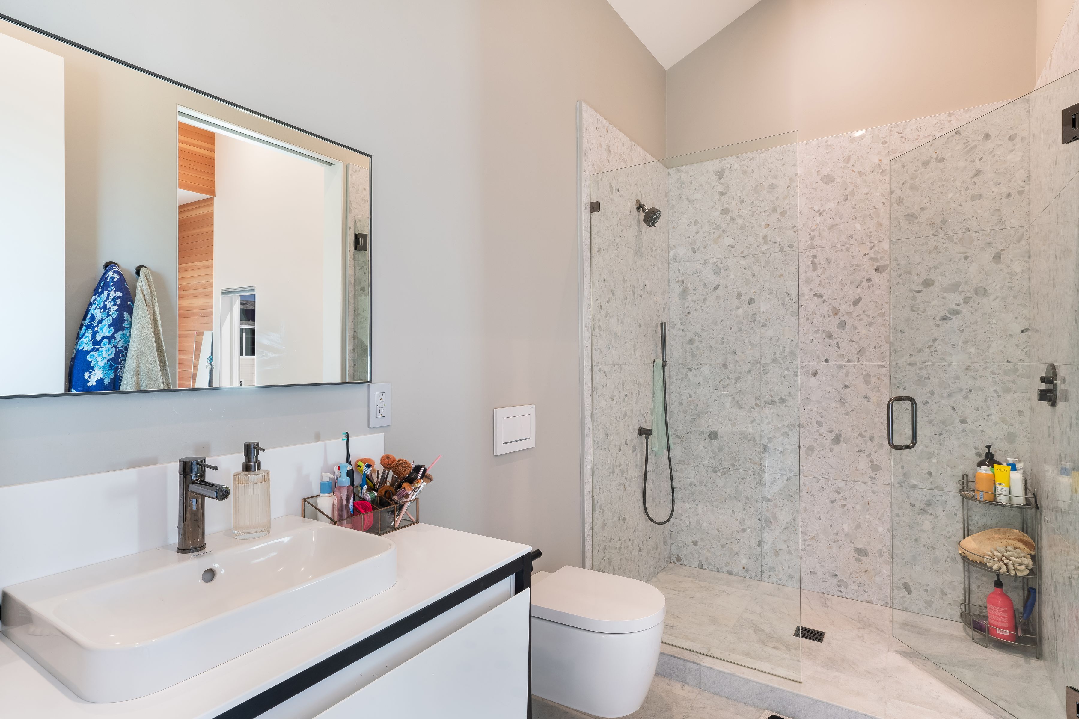 The guest studio/ADU provides exceptional flexibility, featuring a full kitchen, laundry, living and dining area, and a spacious bedroom and bath—perfect for extended family, guests, or a caregiver. A shared upper deck connects the ADU and main residence.